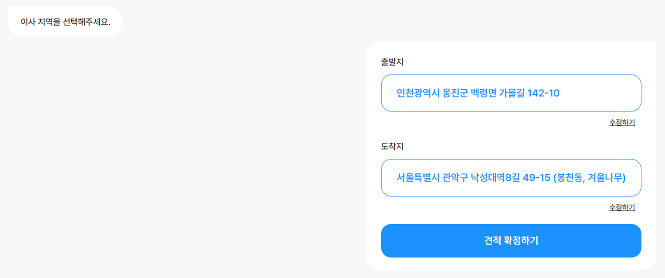 이사 지역을 선택하고, 이사 예정일을 선택하고 이사 형태를 선택하면 최종적으로 손님의 견적이 작성이 됩니다.