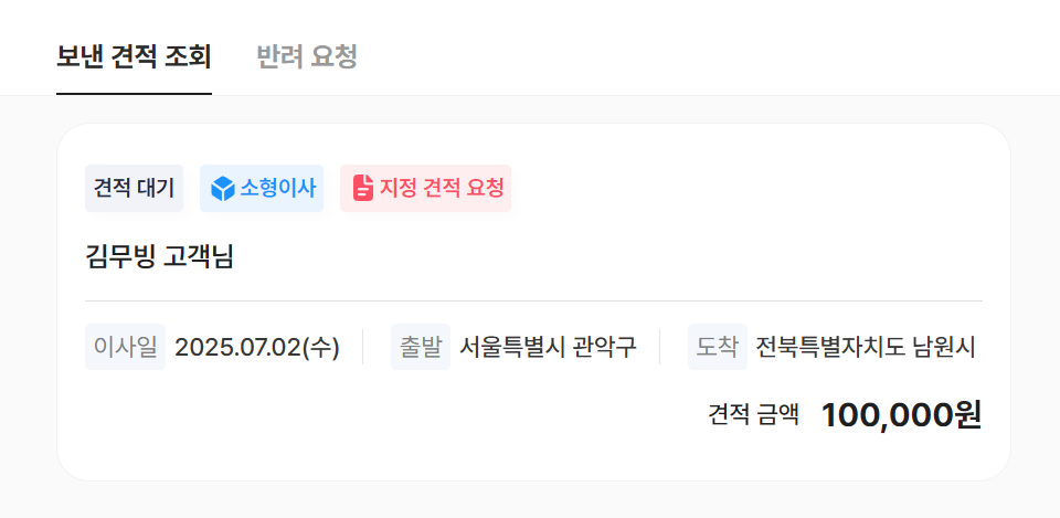 기사님 계정으로 견적 리스트를 확인할 수 있고 견적을 보내거나 만약 지정 요청일 경우 반려가 가능합니다.