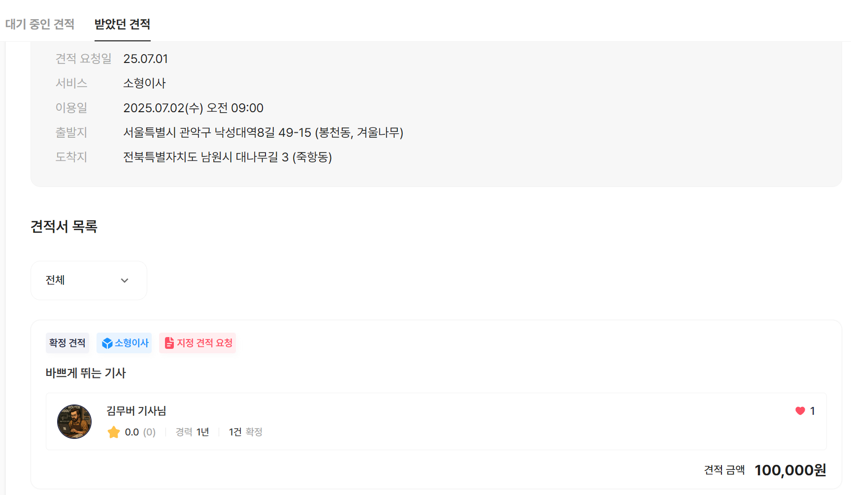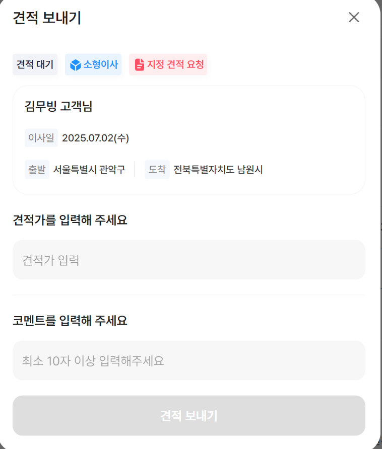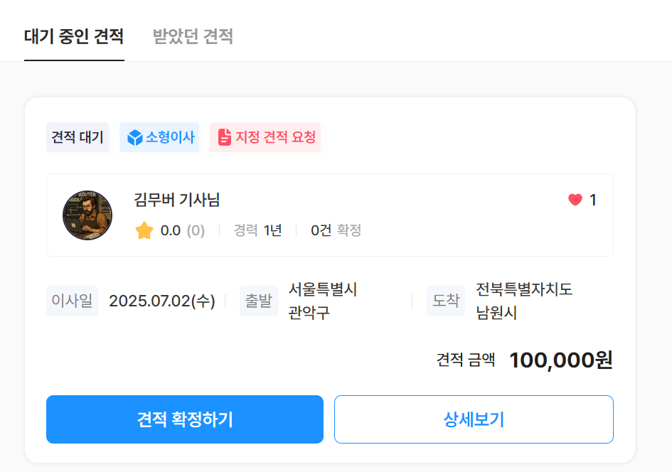 기사님 계정으로 견적 리스트를 확인할 수 있고 견적을 보내거나 만약 지정 요청일 경우 반려가 가능합니다.