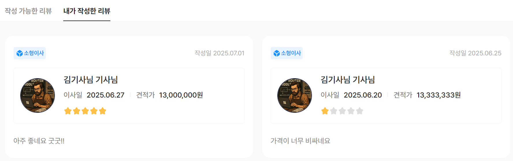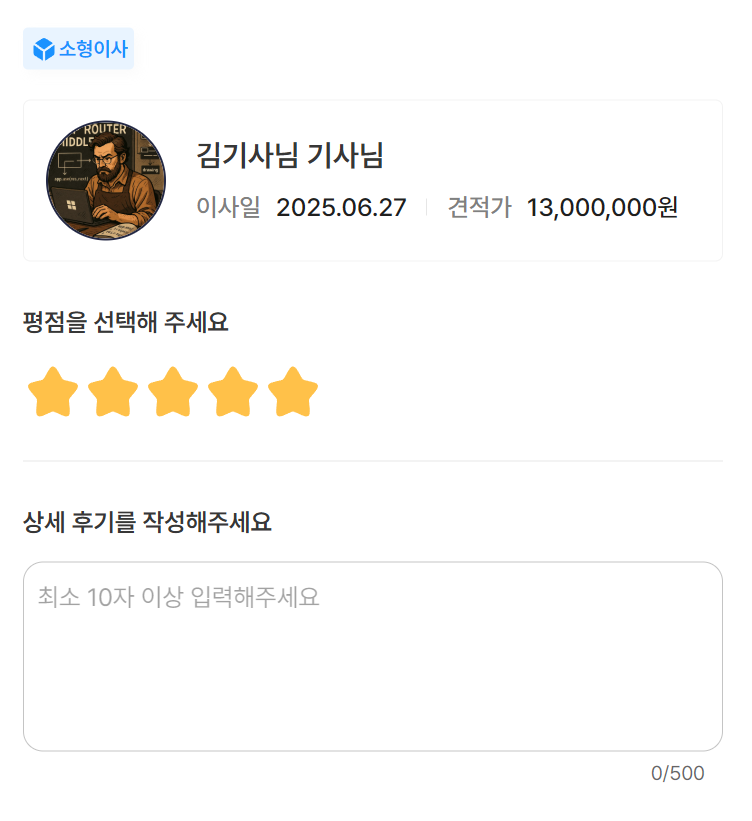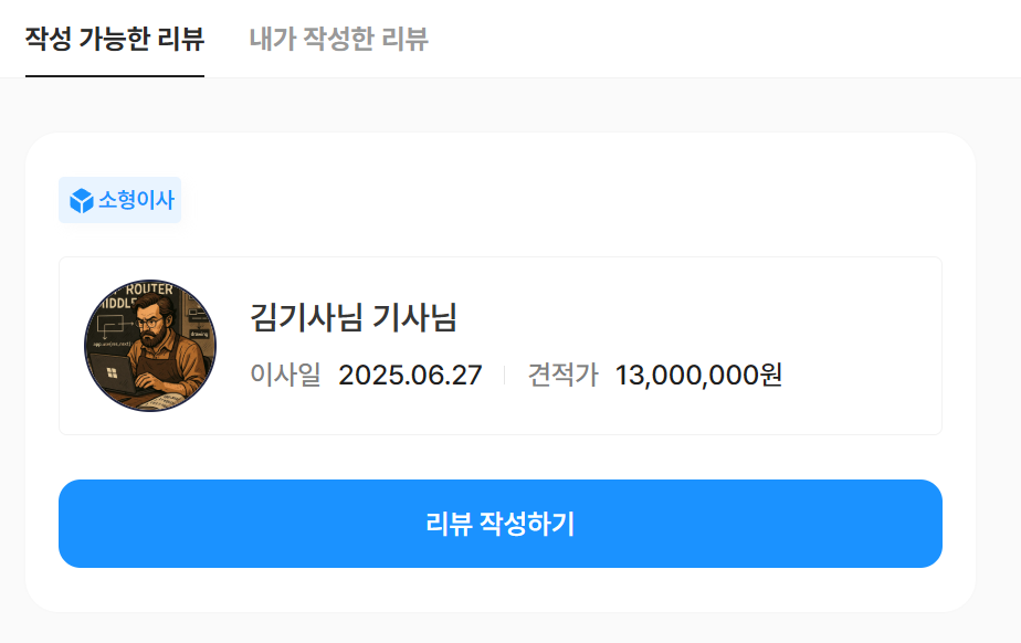 그러면 손님은 기사님에게 리뷰를 작성할 수 있습니다. 작성한 리뷰는 "내가 작성한 리뷰" 페이지에서 확인할 수 있습니다.