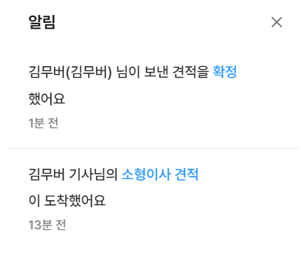 손님은 대기 중인 견적에서 견적 요청을 확정할 수 있고 확정하고 나면 받았던 견적에서 확인할 수 있습니다. (알림)
