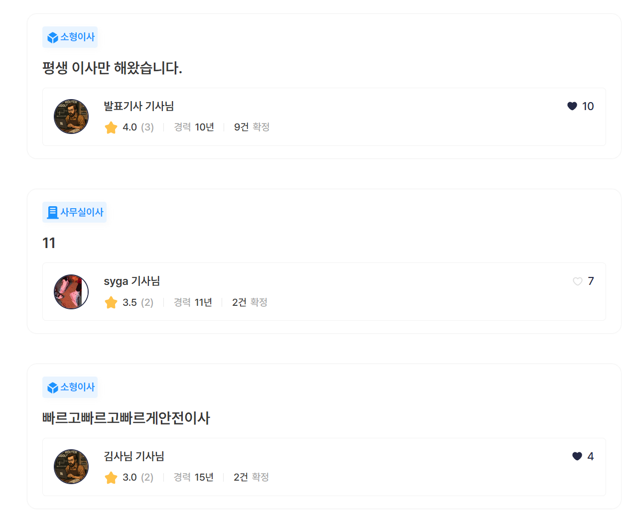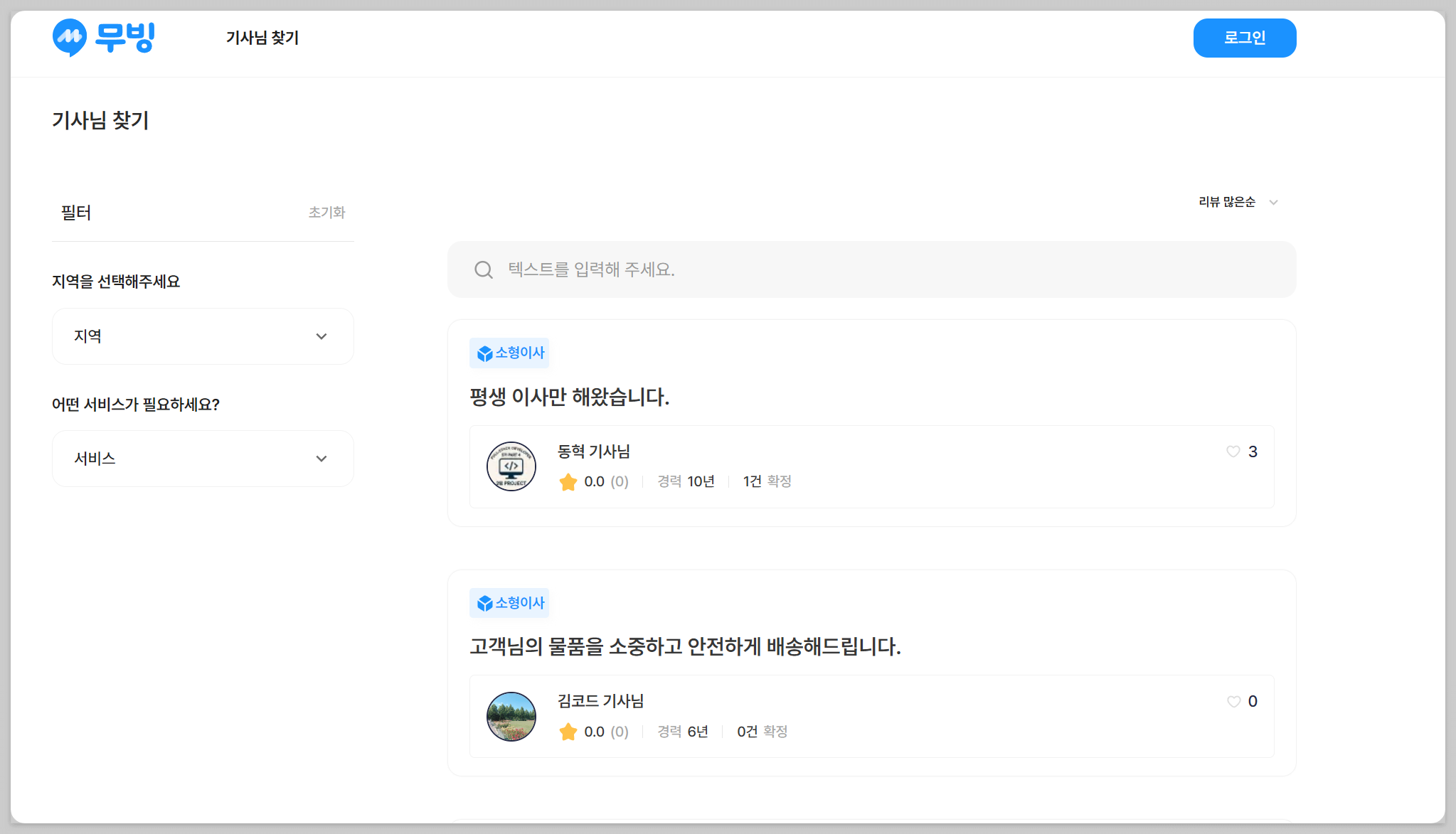 비로그인 사용자도 기사님 리스트를 확인할 수 있습니다. 각 리스트를 클릭하면 기사님 상세 페이지로 넘어가게 됩니다.