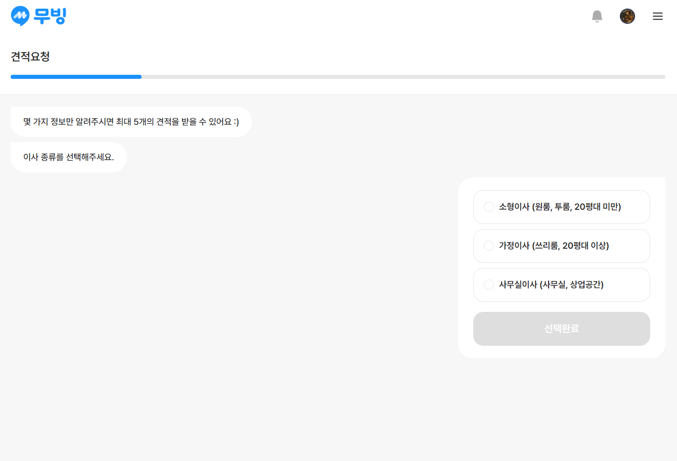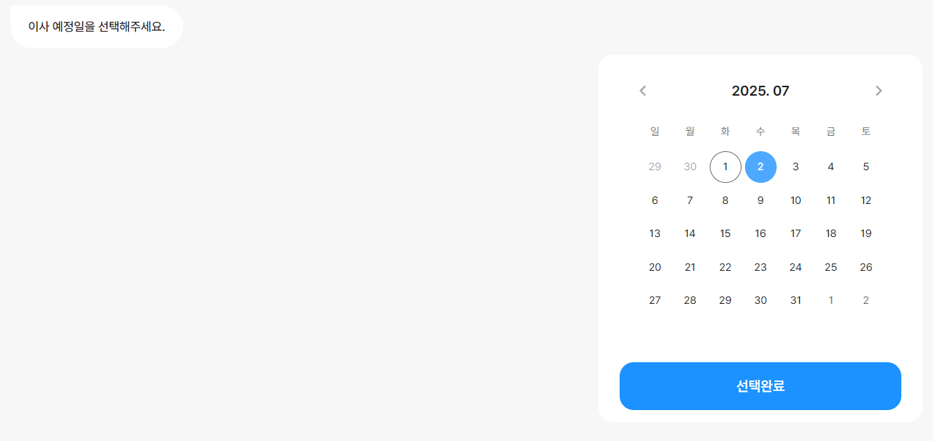 이사 지역을 선택하고, 이사 예정일을 선택하고 이사 형태를 선택하면 최종적으로 손님의 견적이 작성이 됩니다.