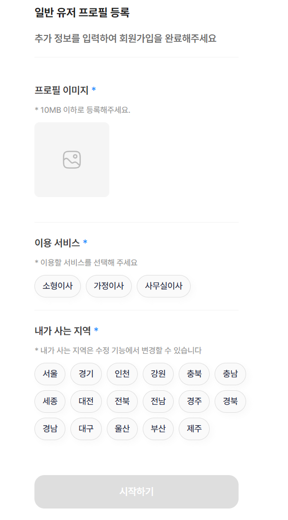 로그인이 완료되면, 프로필 등록 페이지로 넘어가고 손님은 프로필 등록을 진행하지 않으면 손님 전용 기능을 사용할 수 없습니다.