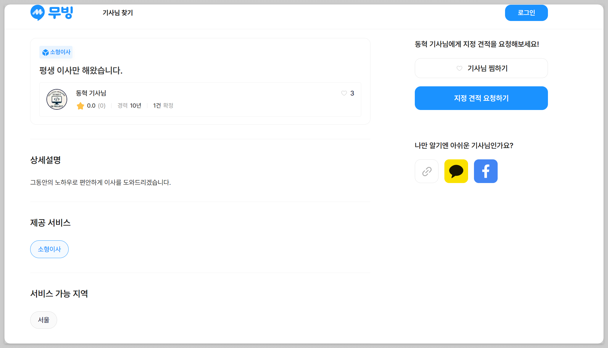 기사님 상세 페이지입니다. 찜하기와 지정 견적 요청은 로그인 이후에 가능합니다.
