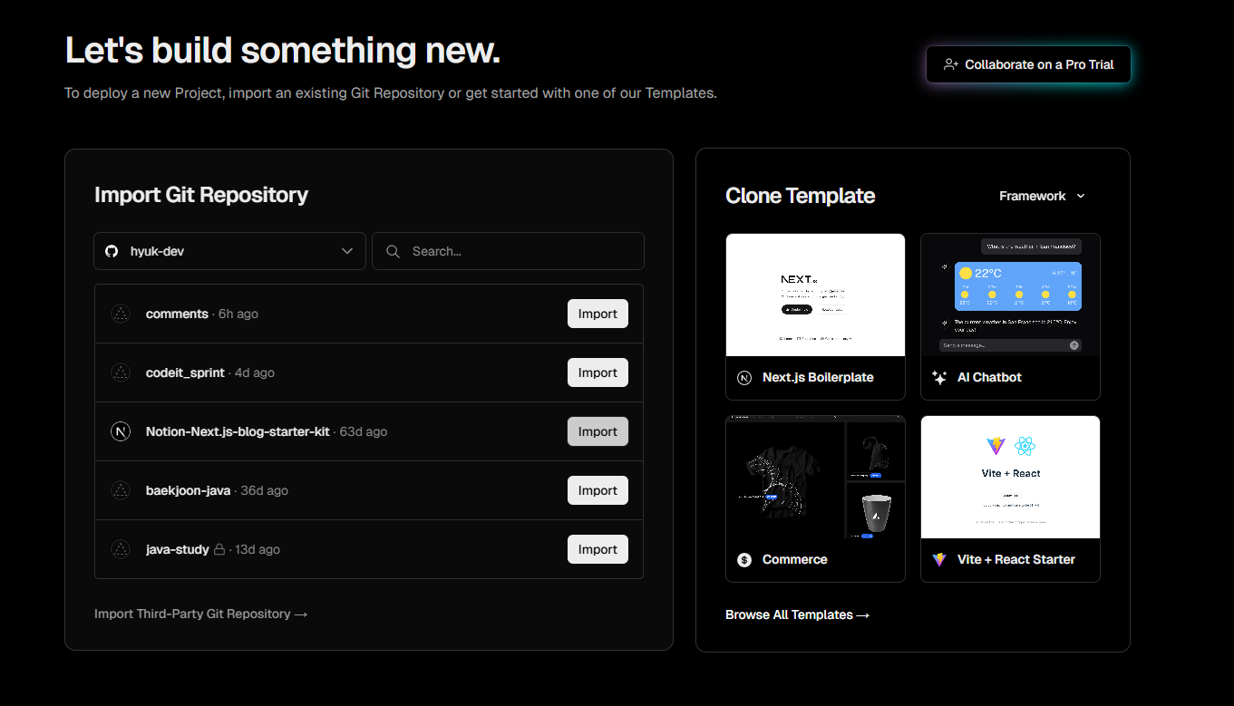 위에서 테마를 깃허브에 정상적으로 설치가 되었다고 가정하고, Vercel에서 배포하는 방법을 알려드리겠습니다.