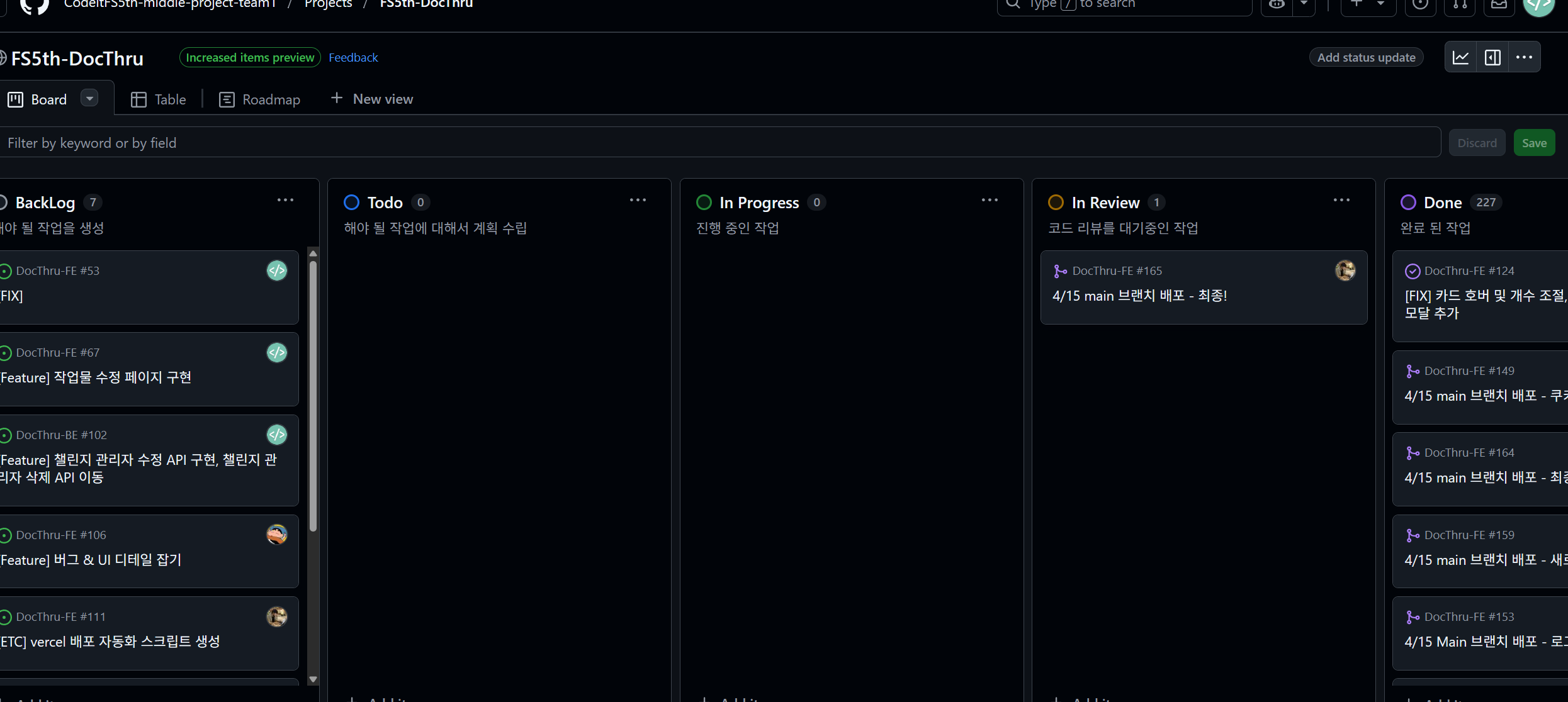 노션 및 깃허브 프로젝트를 사용하여 문서화 작업 및 소통하고 작업 현황을 확인하도록 했습니다.
