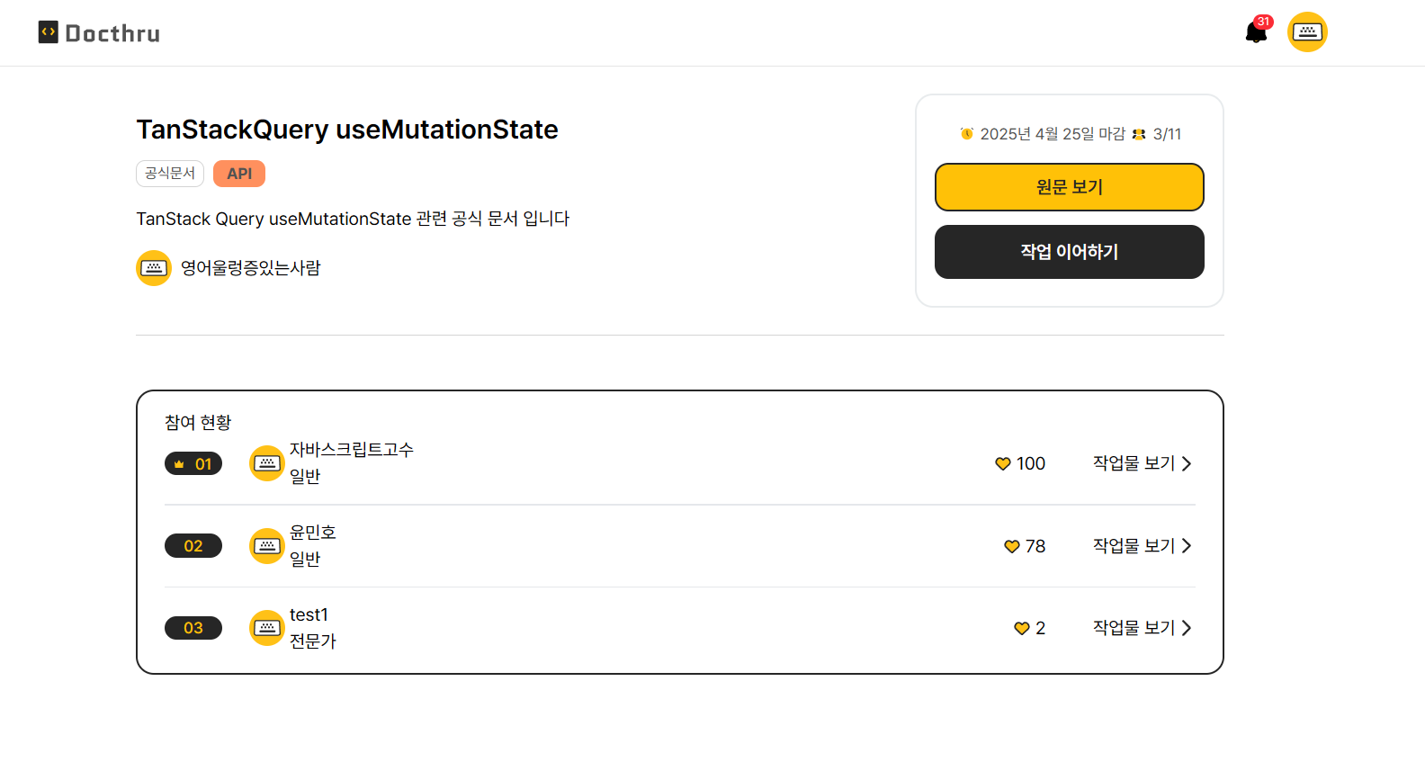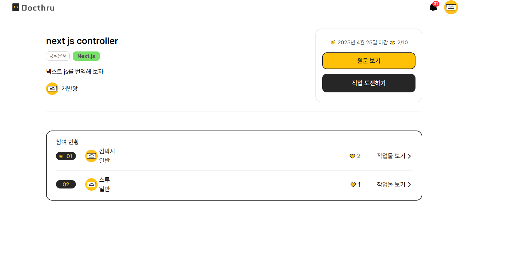 작업물을 작성했을 시에는 참여 현황에 뜨게되며, 해당 챌린지에 인원수가 추가되게 됩니다.
