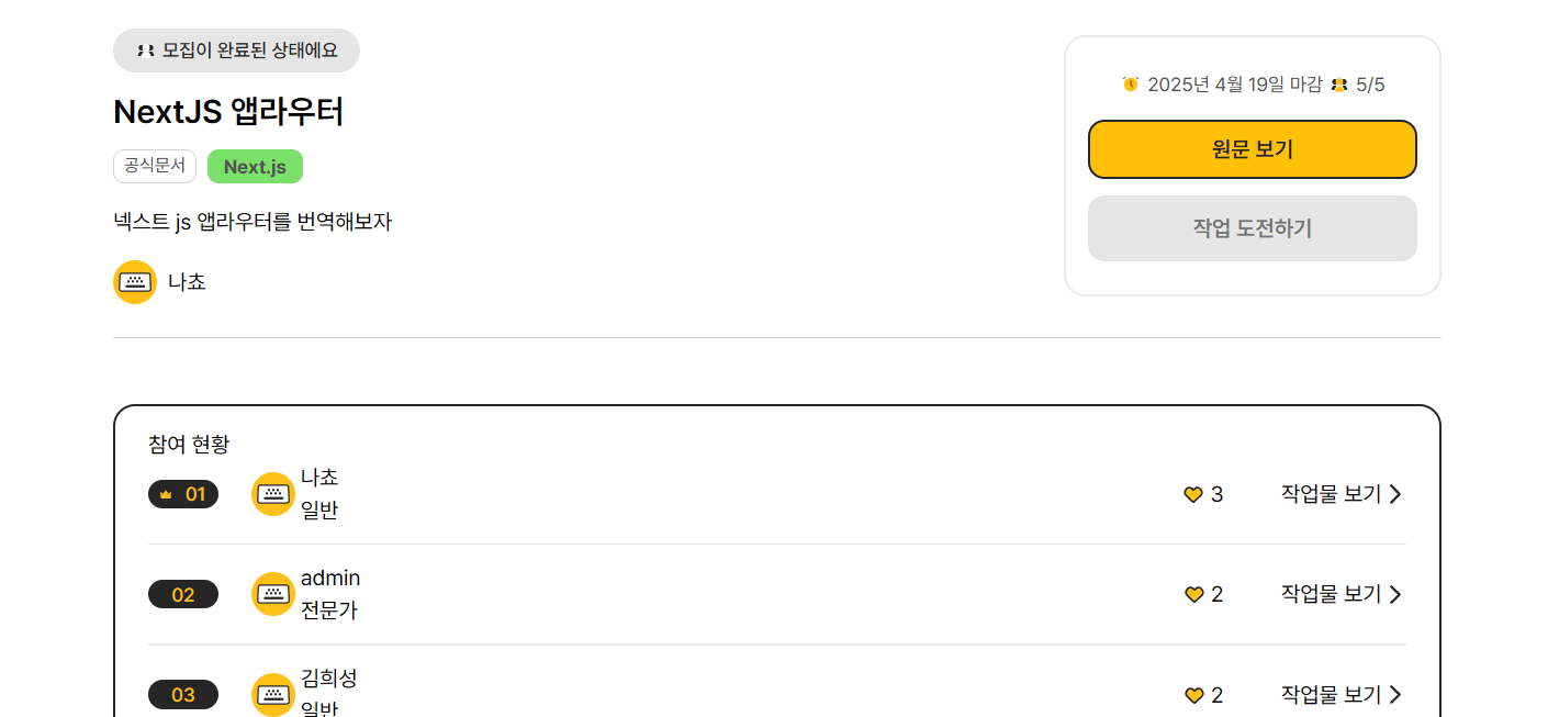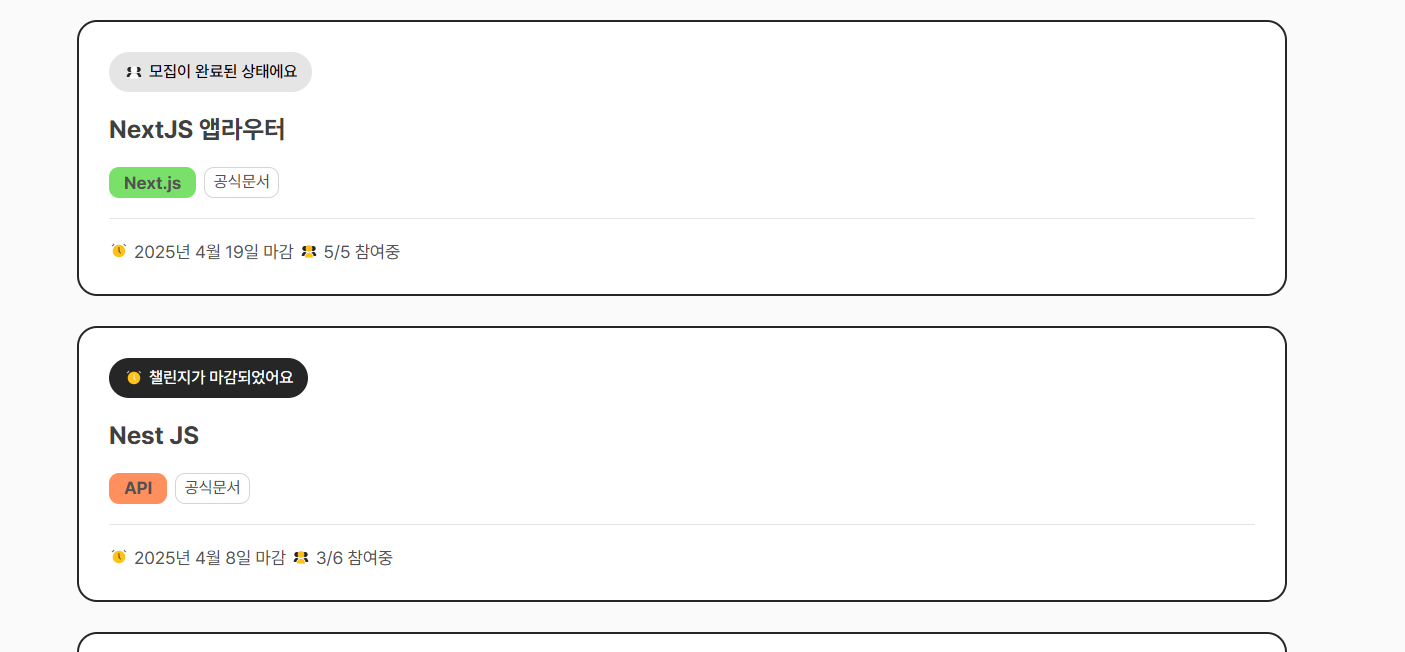 이렇게 챌린지가 마감 된 상태에서는 작업 도전하기 버튼이 비활성화가 되고, 챌린지 목록에서도 태그로 보여지게 됩니다.