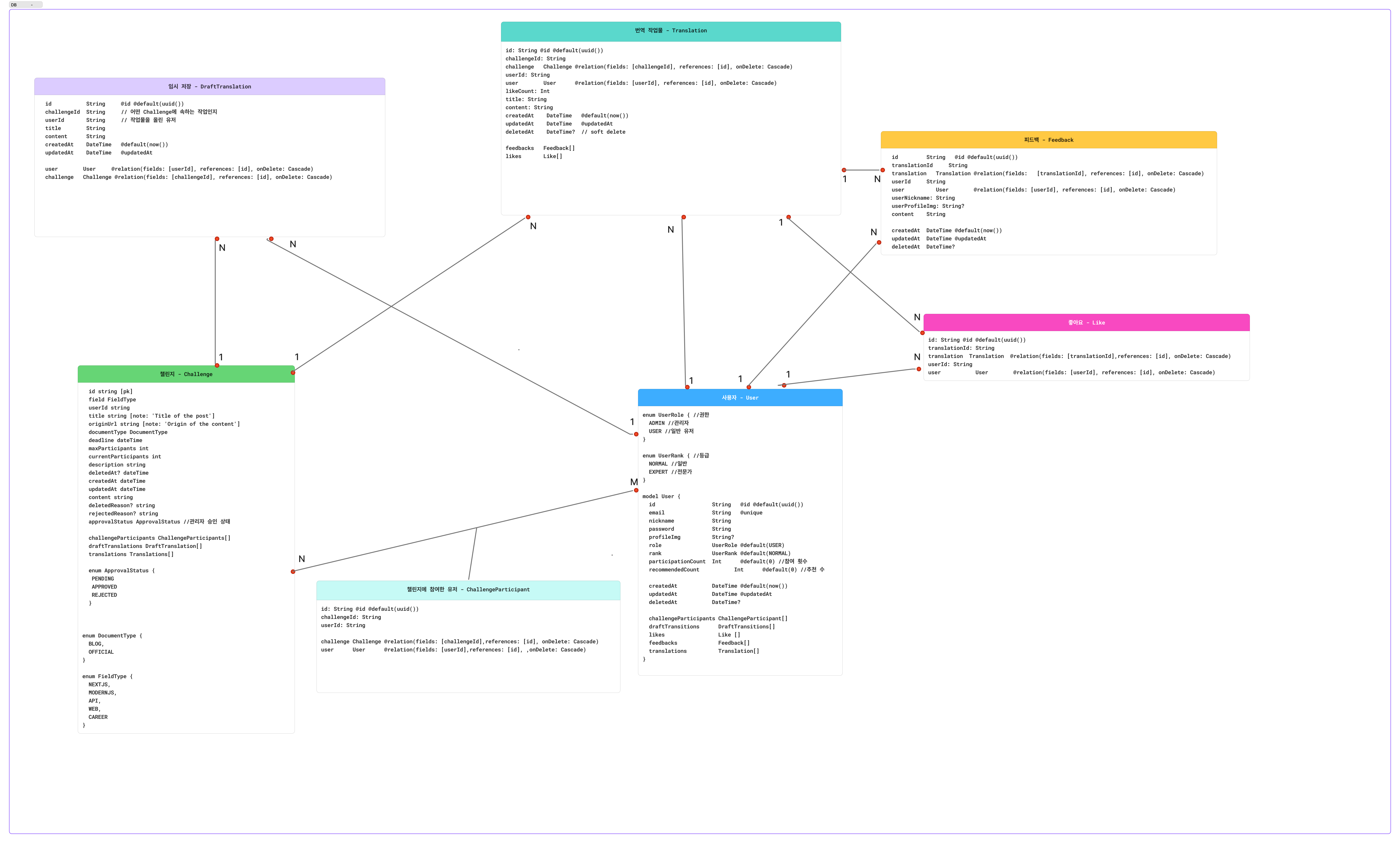 초기에 DB 모델링을 진행할 때는 관계를 설정하지 않았다가, 프로젝트를 진행하면서 백엔드 개발을 시작했을 때 관계 없이 로직만으로 구현하다가 로직이 복잡해지고, 그로 인해 개발 속도가 늦어지는 문제가 발생하였습니다.