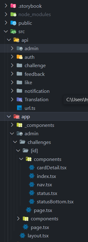 프론트는 기본적인 앱라우터 폴더구조를 따랐으며, 각 페이지마다 쓰이는 컴포넌트를 components 폴더에 따로 분리해서 작업했습니다. api같은 경우에는 공통으로 사용하는 customFetch를 만들어 팀원 전체가 사용하도록 구현되었습니다.