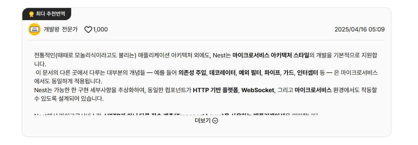 마감기한이 끝나면 최다 추천 번역 목록을 챌린지 상세 페이지에서 확인할 수 있습니다.