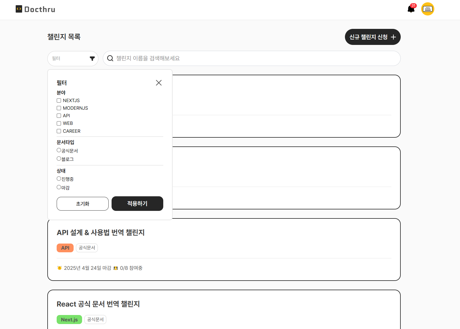 필터를 통해 원하는 정보만 필터링하여 볼 수 있습니다. 또한 로그인 이후에는 알림이나 나의 챌린지로 갈 수 있는 프로필 메뉴 등이 있습니다.